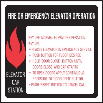 6" x 6" Elevator Fire & Emergency Signage Elevator Car Stations. Plastic non-glare finish. Process subsurface inks resist sun and light fading. Full 3M back adhesive.