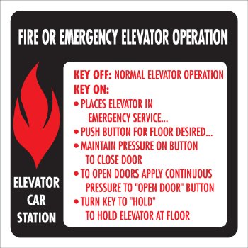 6" x 6" Elevator Fire & Emergency Signage Elevator Car Stations. Plastic non-glare finish. Process subsurface inks resist sun and light fading. Full 3M back adhesive.