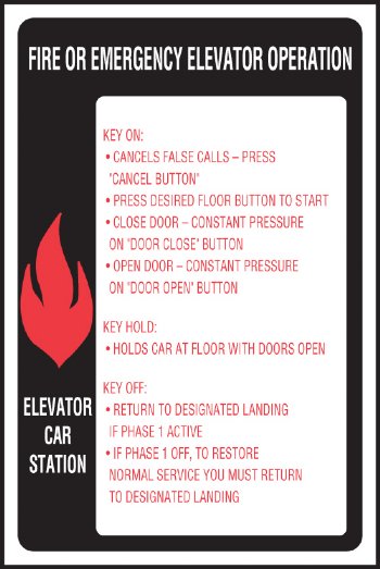 6" x 9" Elevator Fire & Emergency Signage Elevator Car Stations. Plastic non-glare finish. Process subsurface inks resist sun and light fading. Full 3M back adhesive.