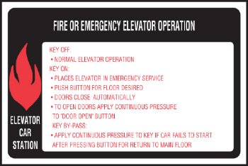 9" x 6" Elevator Fire & Emergency Signage Elevator Car Stations. Plastic non-glare finish. Process subsurface inks resist sun and light fading. Full 3M back adhesive.