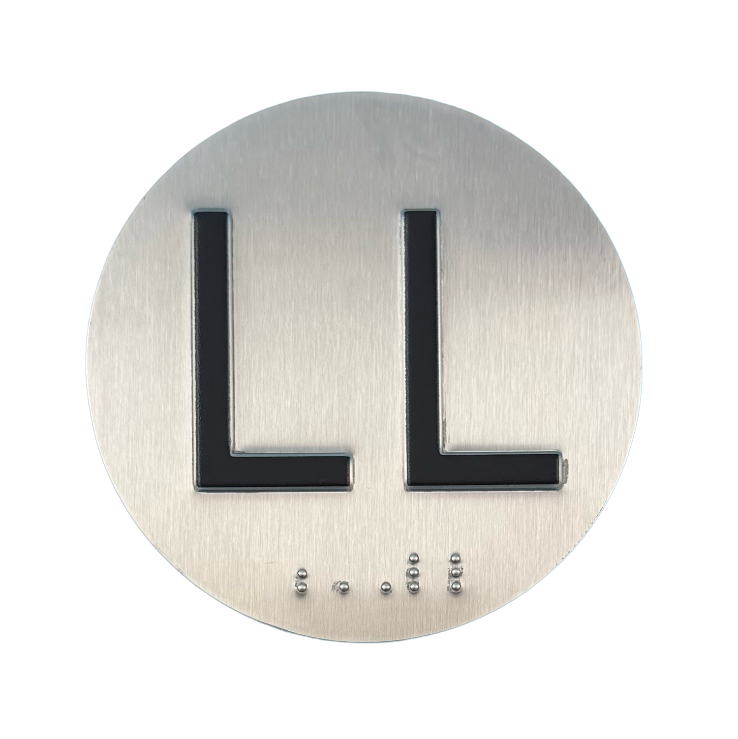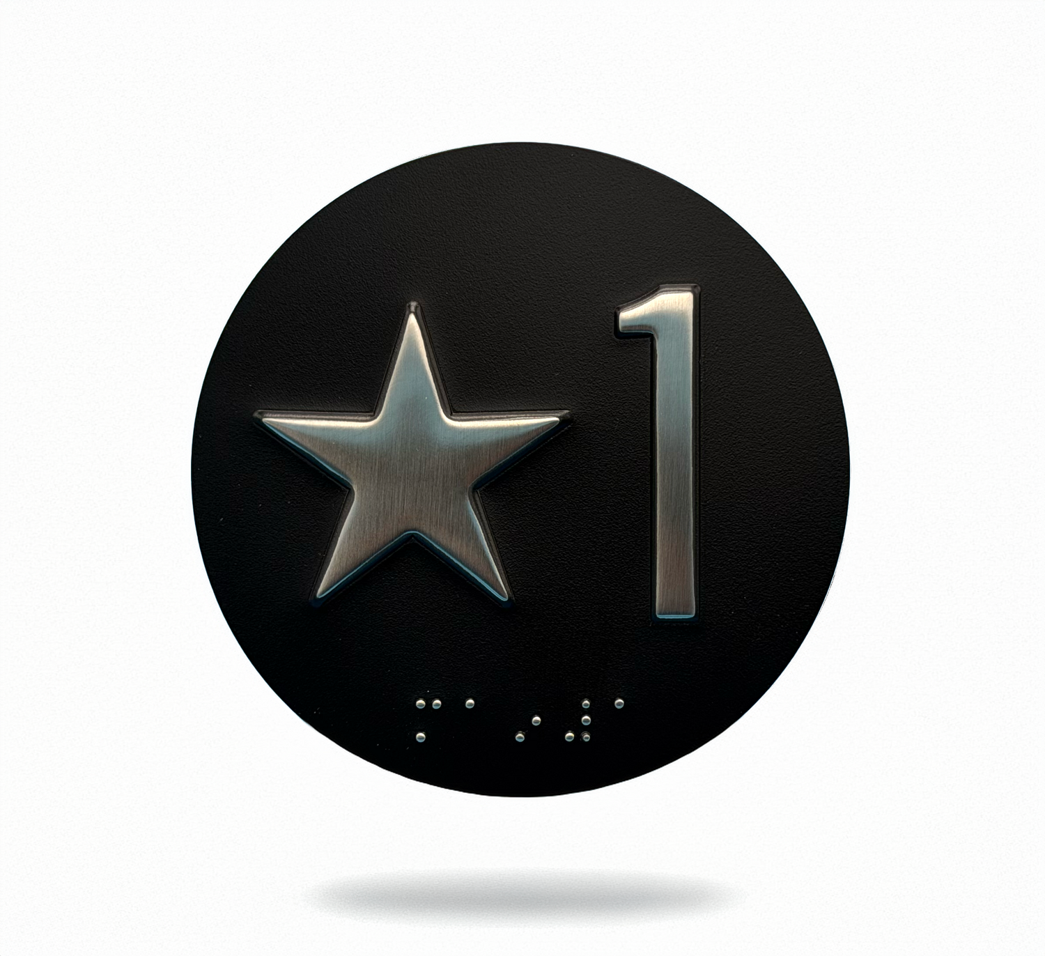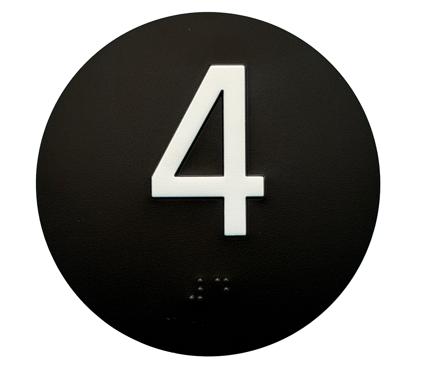 4.5" diameter (114.3 mm) 19 gauge (.040" thick) Stainless Steel Elevator Jamb Braille Plates. Meets all ADA standards. Thickest solid stainless steel jamb plate in the industry. News Gothic typestyle with two Alphanumeric Characters per Plate. 3M VHB adhesive. Call for drive pin holes or stud mounting options.
