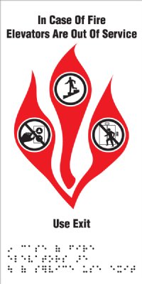 5.5" x 11” In Case of Fire Elevator Signage with Braille. Plastic non-glare finish. Process subsurface screen inks resist sun and light fading. Full 3M back adhesive.