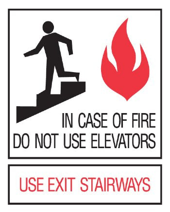 8" x 10" In Case Of Fire Elevator Signage. Plastic non-glare finish. Process subsurface screen inks resist sun and light fading. Full 3M back adhesive.