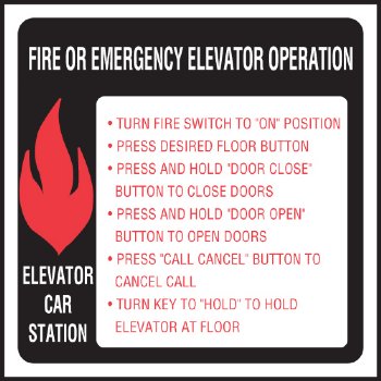 6" x 6" Elevator Fire & Emergency Signage Elevator Car Stations. Plastic non-glare finish. Process subsurface inks resist sun and light fading. Full 3M back adhesive.