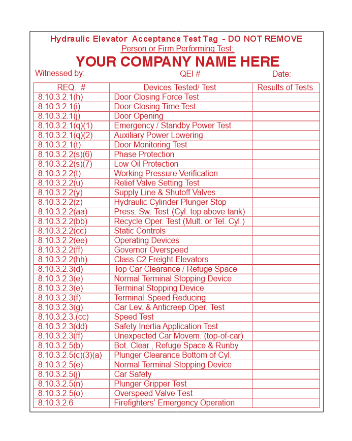 4.625" x 6" (127 mm x 127 mm). Red Printing on Anodized Aluminum. Printed Metal Elevator Name Plates & Data Tags. ANSI A17.1-2022 Code Compliant